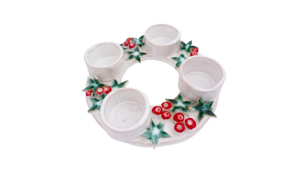 Ručně tvarovaný a vypalovaný keramický stojan na adventní svíčky zdobený červenými vánočními bobulemi. Do stojanu lze umístit adventní svíčky o průměru do 5cm.